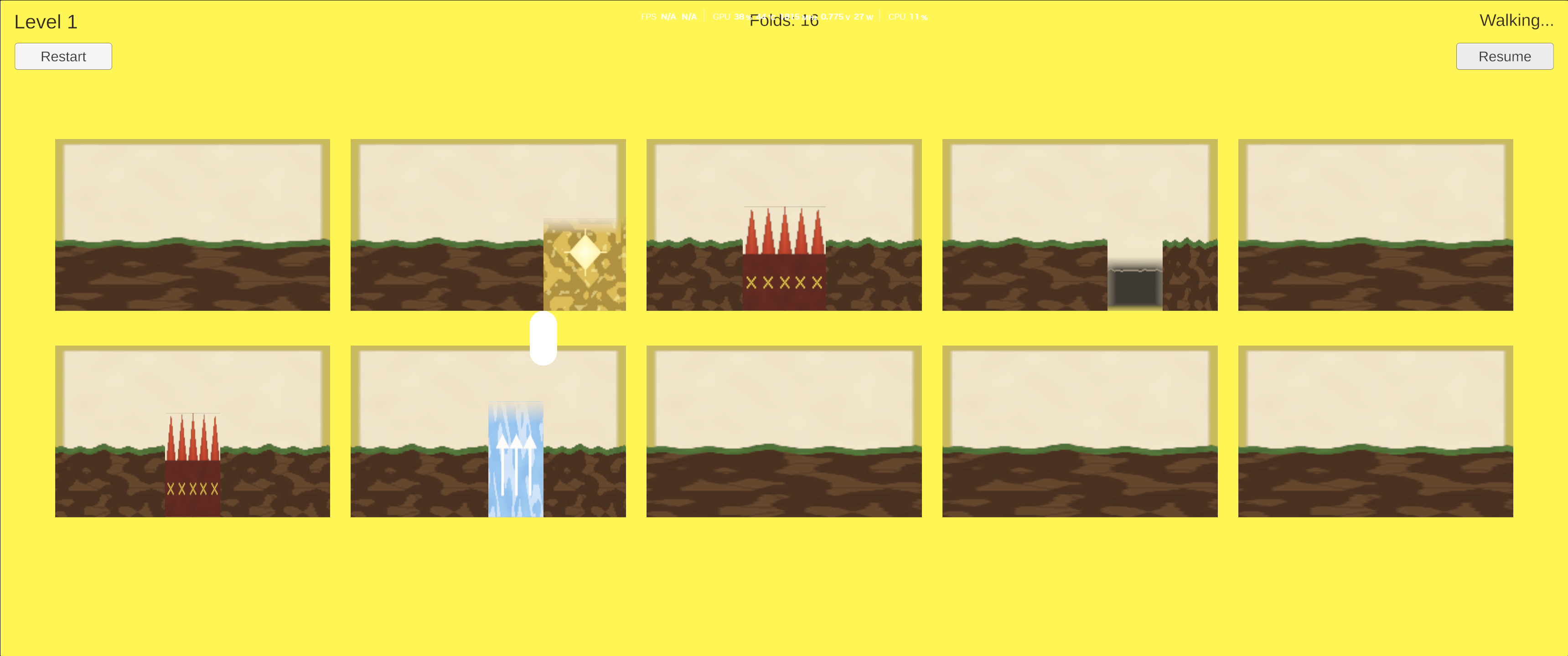 A lone figure walks endlessly across a paper stage divided into panels. Your job is to fold the grid — vertically between columns or horizontally between rows — to rearrange the terrain and create a safe path to the golden goal.